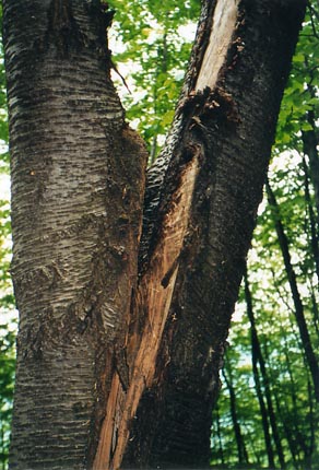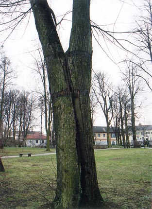 Im Laufe des langen Baumlebens treten immer wieder Totäste und problematische Wuchsformen auf, wenn die Kronenentwicklung nicht beobachtet und gegebenenfalls erziehend eingegriffen wird. Totäste oder Äste mit tiefreichenden Fäuleherden sollten entfernt werden, wenn von diesen eine Gefahr ausgehen kann. Diese Gefährdung kann mittels moderner Meßgeräte gut abgeschätzt werden. Gefährliche Zwiesel Zu spätes Entfernen von einem kodominanten Stämmling führt meist zu Schäden infolge Wundfäule oder Unterversorgung des Wurzelsystems. Sind im späteren Baumalter Zwieselbildungen vorhanden, so sollte ihnen bei der Baumkontrolle hohe Aufmerksamkeit gewidmet werden. Besondere Vorsicht ist bei eng stehenden Stämmlingen geboten, da diese durch das Dickenwachstum letztlich zum Auseinanderdrücken neigen und Kronenbrüche vorprogrammiert sind. Zur Kronensicherung empfiehlt sich der Einbau einer Kronenverankerung mit erprobten Gurtensystemen. Können bei der Baumkontrolle bereits Rißbildungen festgestellt werden, so ist Gefahr in Verzug, hier ist rasches Handeln geboten. In diesem Fall hilft nur noch der Einbau einer sehr niedrigen Seilverankerung oder einer bzw. mehrerer Gewindestangen bei gleichzeitiger Entlastung der Krone. |