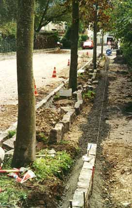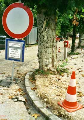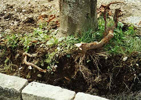 Im urbanen Bereich sind Bäume einer andauernden Streßsituation ausgesetzt, da ihre Entwicklung meistens schon vom vorhandenen Durchwurzelungsraum begrenzt ist. Wenn sich aber ein Baum an die gegebene Situation nach Jahren gewöhnt hat, sind weitere Verletzungen regelmäßig mit einer verminderten Verkehrssicherheit verbunden und führen oftmals zum Ausfall des Baumes. Der wichtigste Teil eines Baumes sind seine Wurzeln, die nicht nur als Haltewurzeln den Baum stützen und absichern, sondern vor allem die Versorgung mit Wasser und Nährstoffen gewährleisten. Dazu braucht ein Baum ein Mindestmaß an Bodenumfeld, das ihn leben läßt. Bei in Mitteleuropa vorkommenden Laubbäumen beträgt dieser Raum etwa die Kronentraufe plus 1,5m und bei Nadelbäumen die Kronentraufe plus bis zu 5m im Radius. Dass dies häufig nicht möglich ist, da Straße, Kanal, Verkabelungen auf engstem Raum liegen, ist leider eine oft gegebene Situation. Wenn der geringere Wurzelraum nicht mit überdurchschnittlicher Wasserzufuhr oder manchmal durch Düngegaben kompensiert wird, ist eine höhere Anfälligkeit für Trocken- oder Nährstoffmangelschäden die Folge. Daher ist es besonders wichtig, dass bei Bauarbeiten auf Wurzeln der ohnehin schon gestressten Bäume Rücksicht genommen wird. Zusätzlich dringen in beschädigte Wurzeln Fäulepilze leichter ein, wodurch eine Kernfäule entstehen und ein Teil des Wurzelsystems absterben kann. Die Versorgung des Baumes wird dadurch noch mehr eingeschränkt. Meist werden auch durch Baumaßnahmen Bodenverdichtungen (Lagerung, Befahrung) hervorgerufen und durch Abdeckung mit undurchlässigen Materalien (Asphalt, Beton) der Luftaustausch unterbunden und das biologische Leben im Boden zerstört. Die Folge ist ein langsames Absterben, das schon nach wenigen Jahren sichtbar wird. Die nebenstehenden Bilder wurden im Zuge von Bauarbeiten aufgenommen. Wurzelraum wurde zu knapp bemessen und obendrein sind die Wurzeln zum Teil massiv beschädigt worden. Bäume benötigen wie alle Lebewesen einen intakten Lebensraum und unter diesen Umständen sind sie längerfristig zum Absterben verurteilt. |
