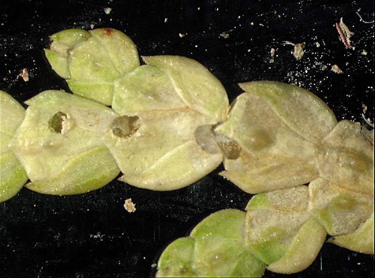 | Moth: light grey with brown and grey dots, about 6mm in size; egg deposition in June; young larvae enter leaf scales two weeks later. Larvae: reddish green to brownish green, head black